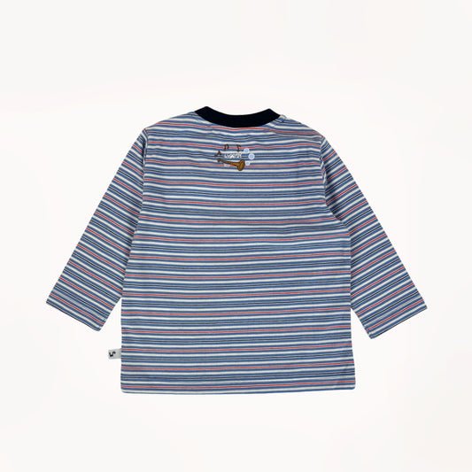 Blauw gestreepte pyjama trui, visje blaast bellen m/ gouden trompet⎪74
