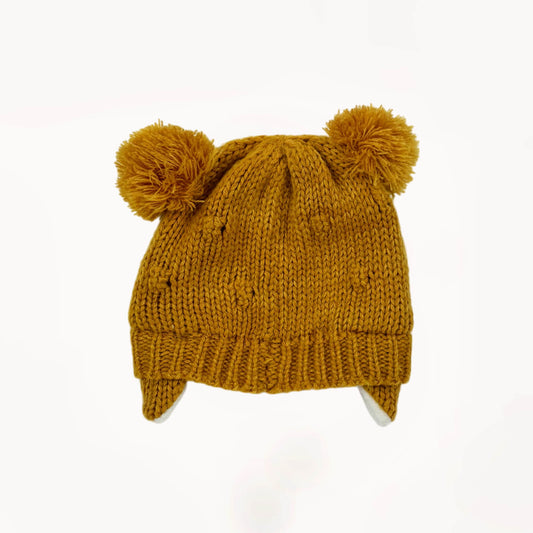 Okergele gebreide muts met 2 pompoms, gewatteerd met oortjes⎪62/68