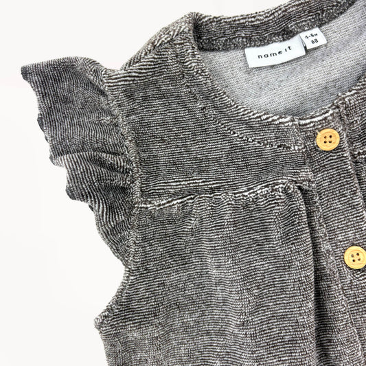 Boxpakje taupe velour, zonder mouwen, ruffles⎪68