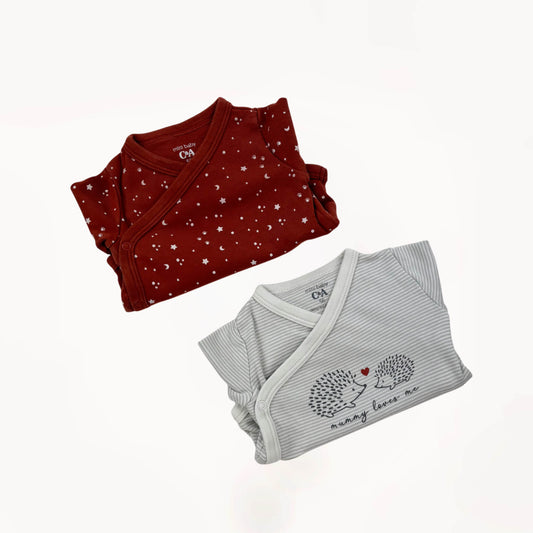 Set 2 overslag rompers winter rood & streepjes, lange mouwen, "mommy loves me"⎪56